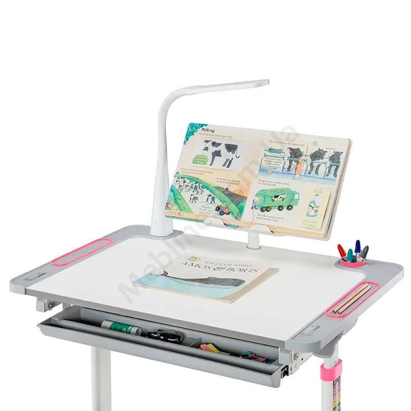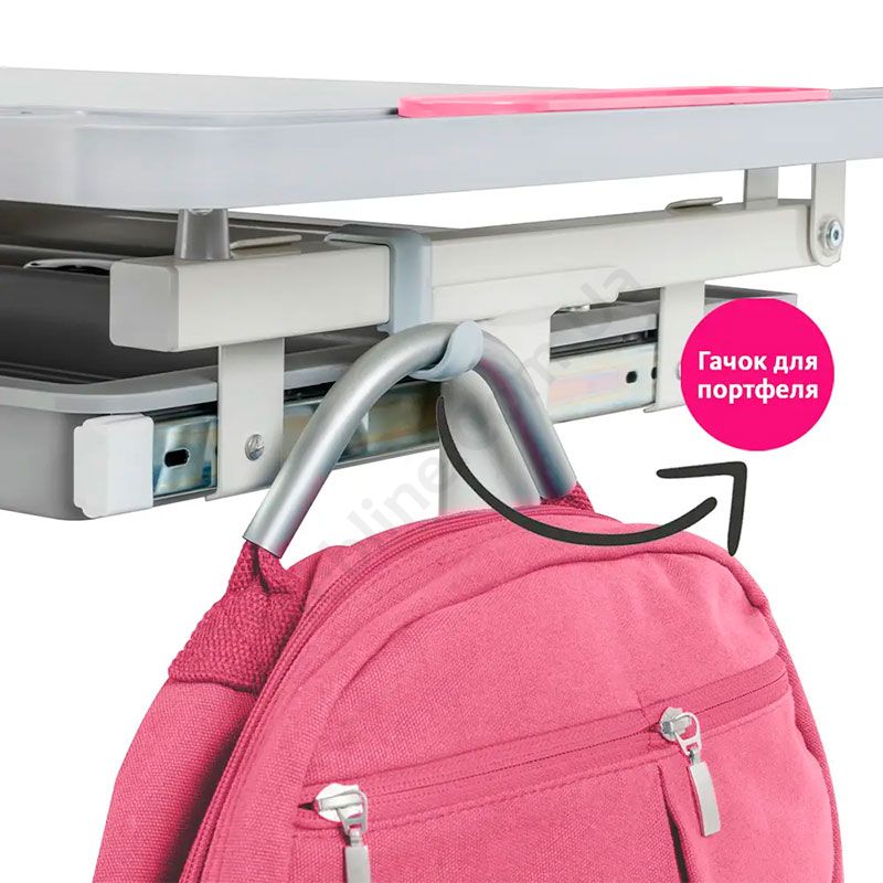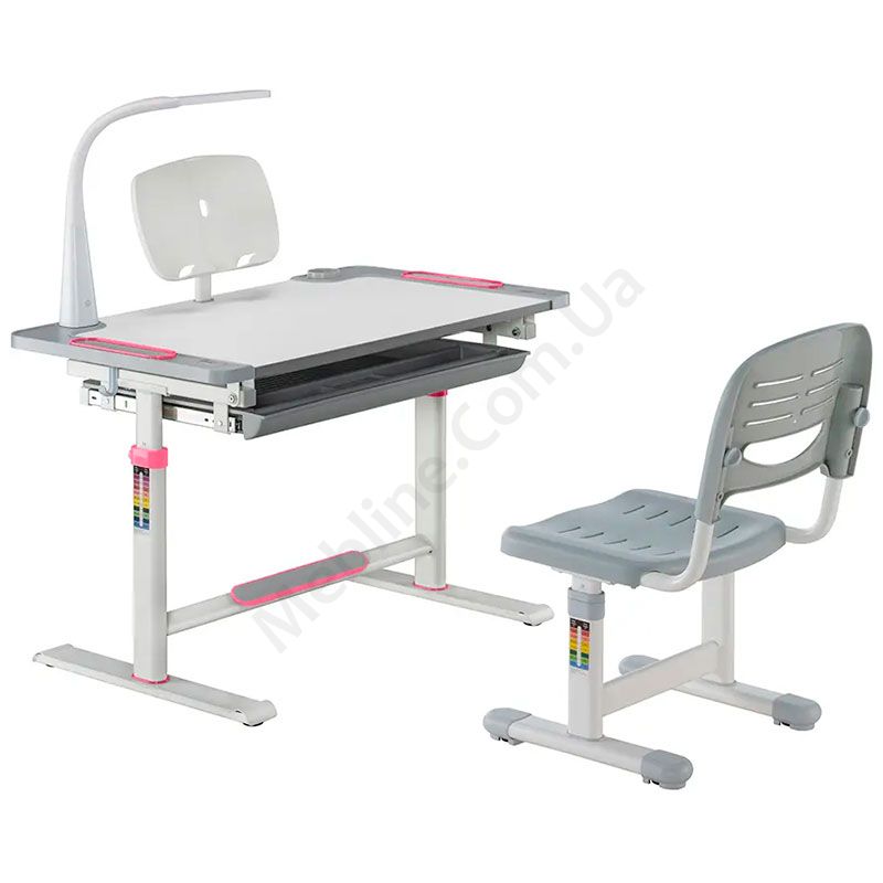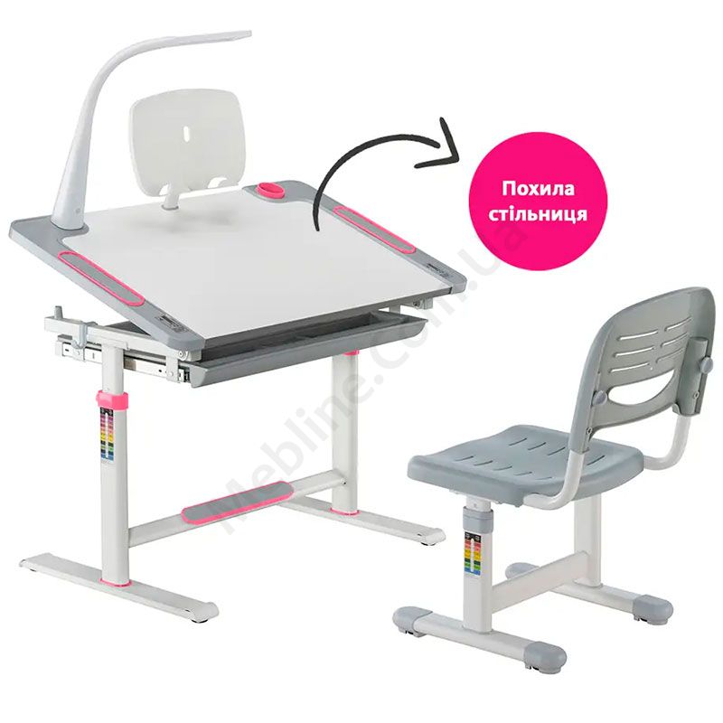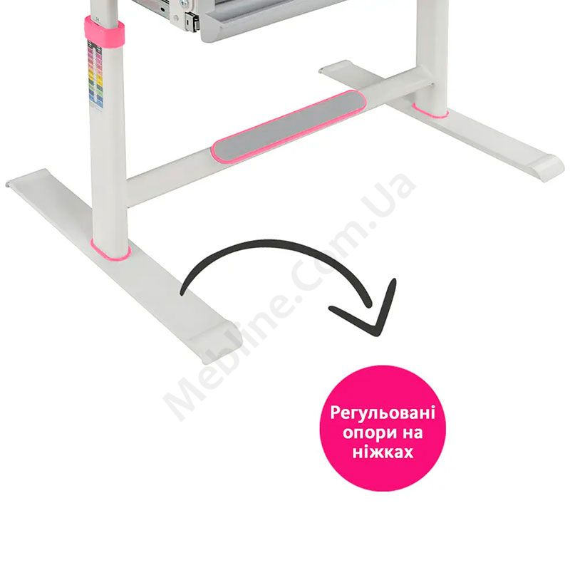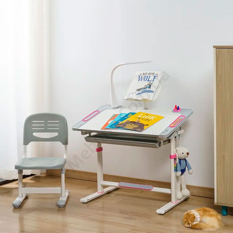 Регульована за висотою парта зі стільчиком біло-рожевого кольору.