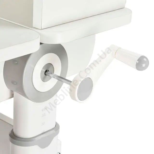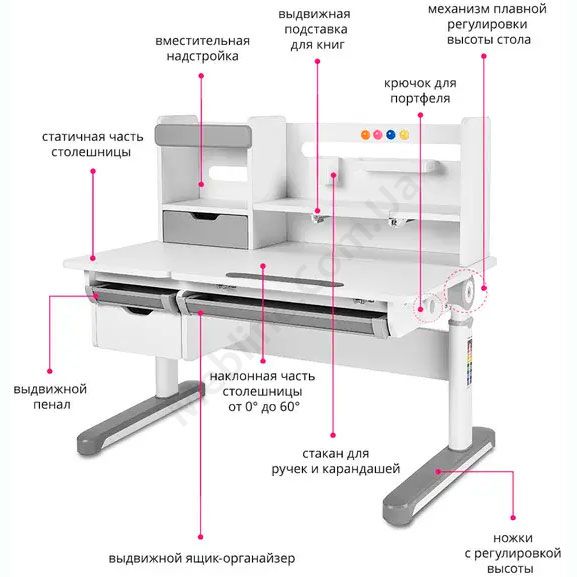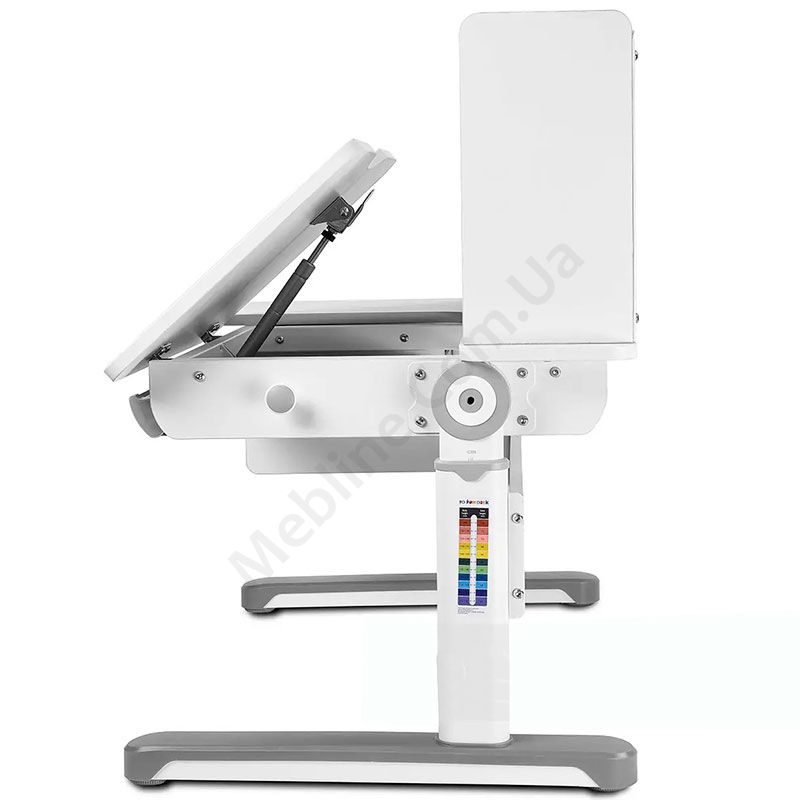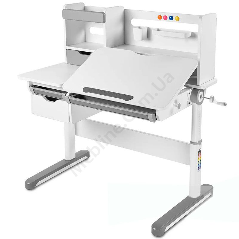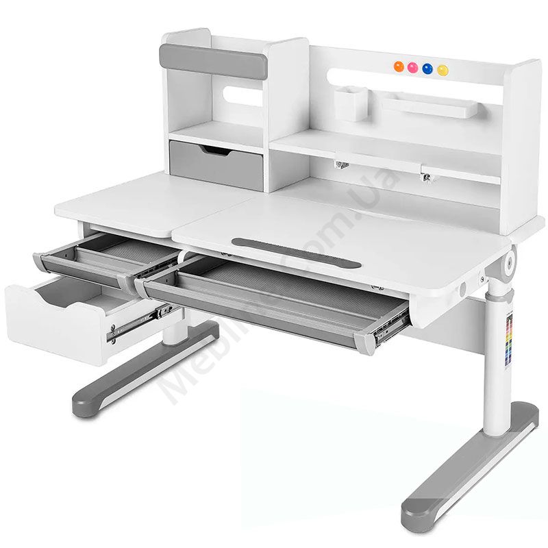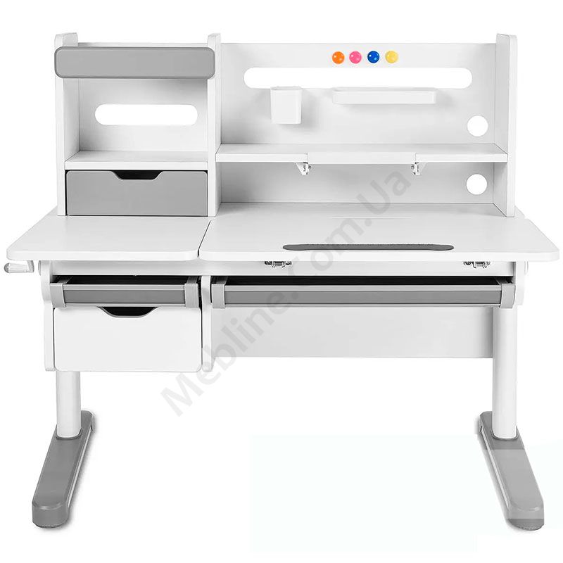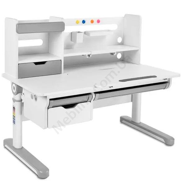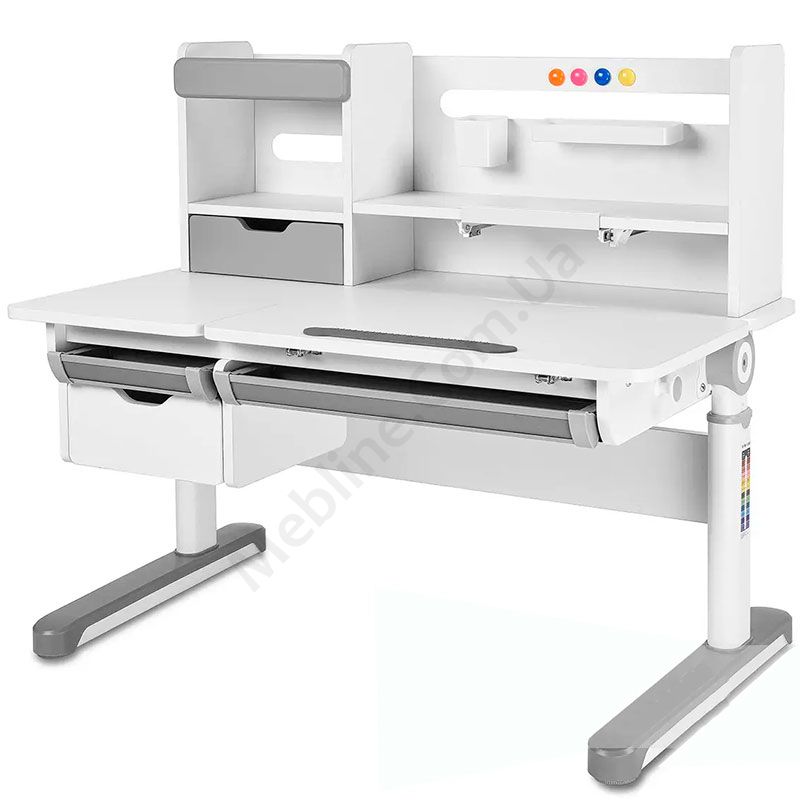 Зростаюча парта біло-сірого кольору з шухлядами, надставкою та регулюванням висоти.