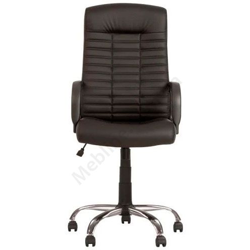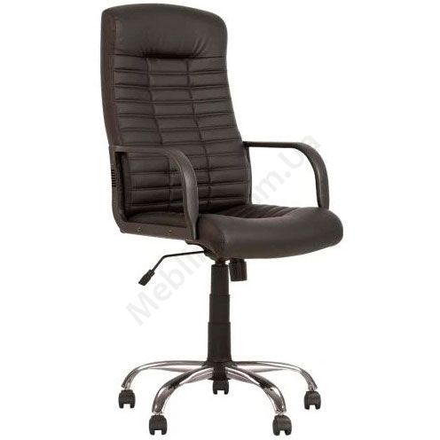 Крісло для керівника з високою спинкою та інтегрованим підголівником, покращеною ергономікою, пластиковим нерегульованими підлокітниками, фіксацією у вертикальному положенні, на хромованій основі.