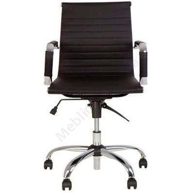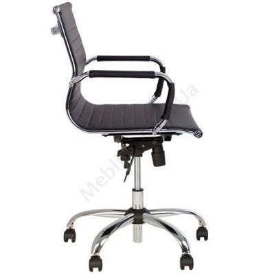 Тонке крісло для керівника з низькою спинкою, нерегульованими підлокітниками з м’якими накладками, фіксацією в будь-якому положенні, на хромованій основі.