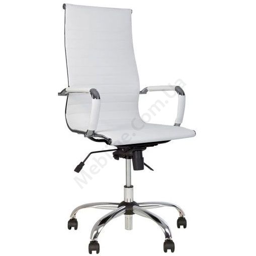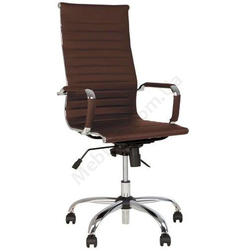 Тонке крісло для керівника з нерегульованими підлокітниками з м’якими накладками, фіксацією в будь-якому положенні, на хромованій основі.