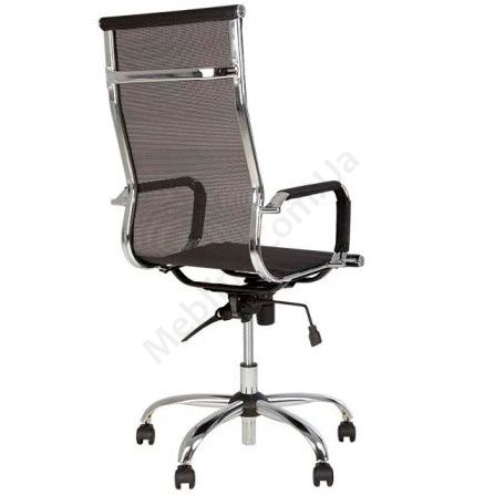 Тонке крісло для керівника з нерегульованими підлокітниками з м’якими накладками, фіксацією в будь-якому положенні, на хромованій основі.