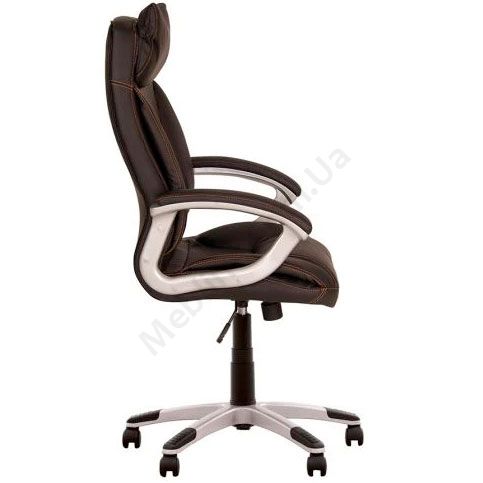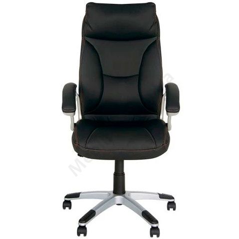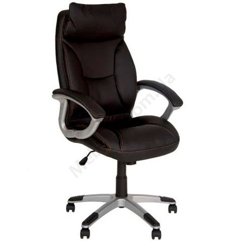 М’яке крісло для керівника з інтегрованим підголівником, підлокітниками з м’якими накладками, фіксацією у вертикальному положенні, на пластиковій основі.