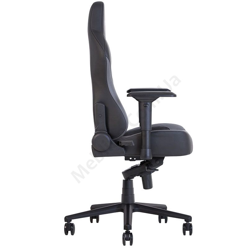 Геймерське крісло в спортивному стилі з регульованими підлокітниками, регулюванням кута нахилу, на сталевій основі.