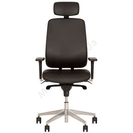 Операторське крісло з вільним гойданням, підголівником, регульованими підлокітниками з м’якими накладками, на металевій основі.