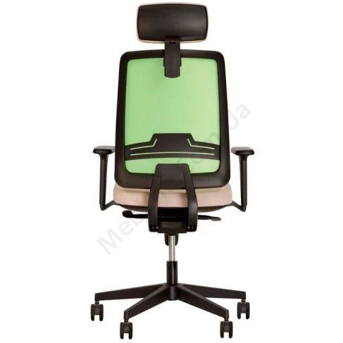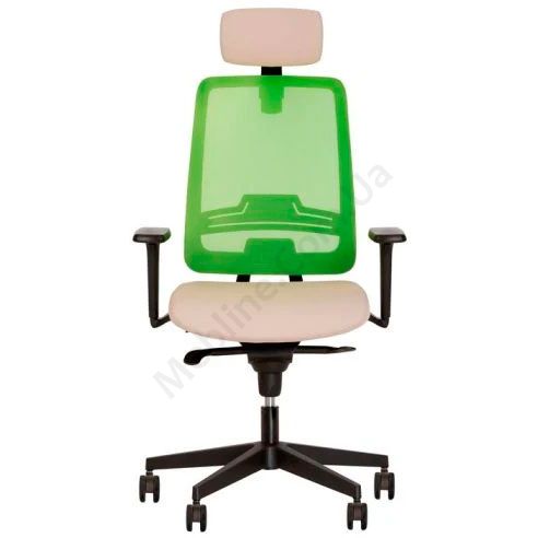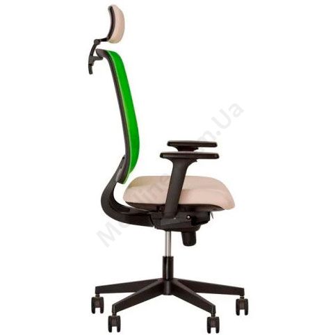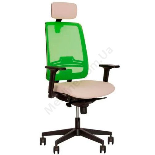 Операторське крісло з вільним гойданням, підголівником, регульованими підлокітниками, сітчастою спинкою, на пластиковій основі.