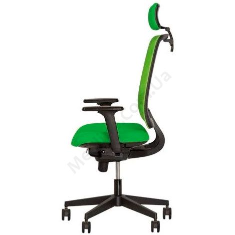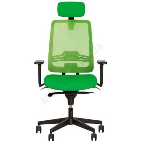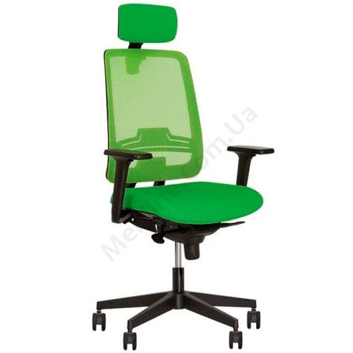 Операторське крісло з вільним гойданням, підголівником, регульованими підлокітниками з м’якими накладками, сітчастою спинкою, на пластиковій основі.