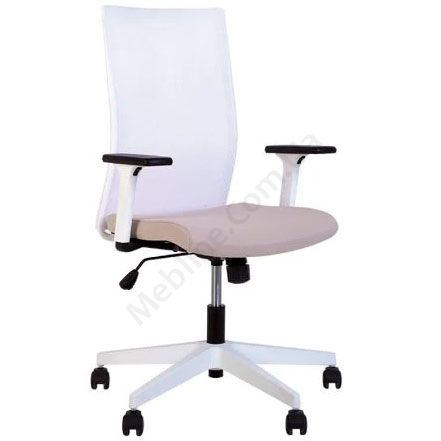 Операторське крісло з сітчастою спинкою, регульованими пластиковими підлокітниками, фіксацією у вертикальному положенні, на білій пластиковій основі.