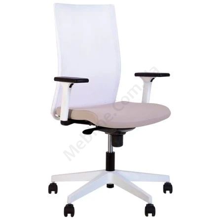 Операторське крісло з сітчастою спинкою, регульованими підлокітниками, фіксацією у 5 положеннях, на білій пластиковій основі.