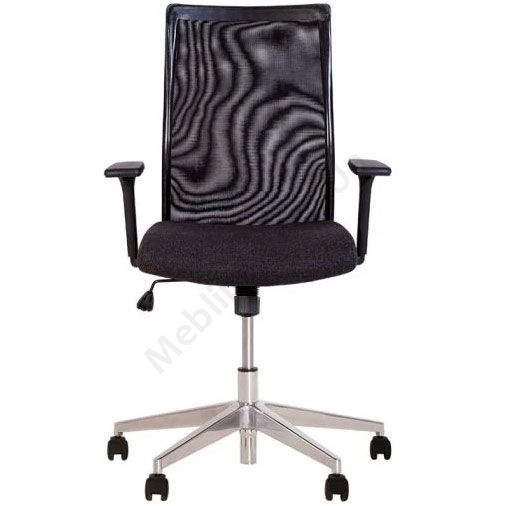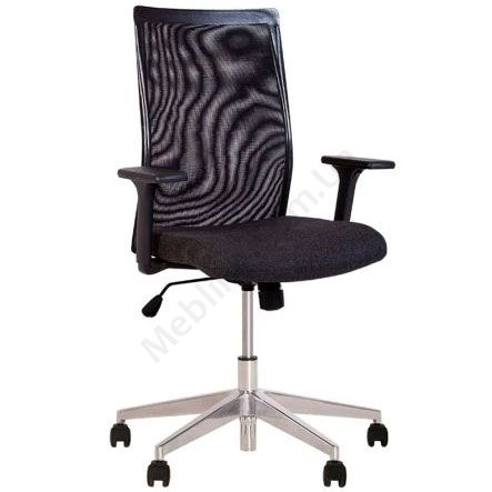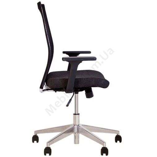 Операторське крісло з сітчастою спинкою, регульованими пластиковими підлокітниками, фіксацією у вертикальному положенні, на хромованій алюмінієвій основі.