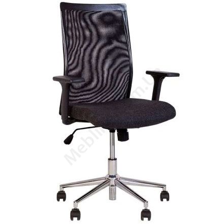 Операторське крісло з сітчастою спинкою, регульованими пластиковими підлокітниками, фіксацією у вертикальному положенні, на металевій хромованій основі.