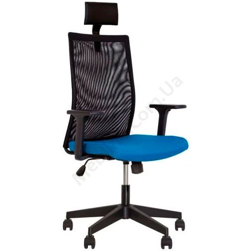 Операторське крісло з сітчастою спинкою, регульованими пластиковими підлокітниками, підголівником, фіксацією у вертикальному положенні, на чорній пластиковій основі.