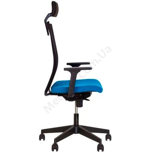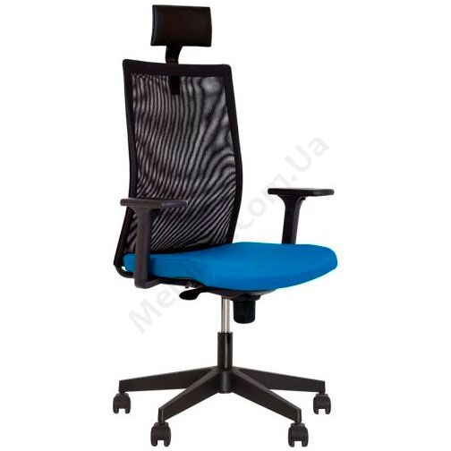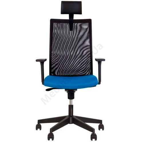 Операторське крісло з сітчастою спинкою, регульованими підлокітниками, підголівником, фіксацією у 5 положеннях, на чорній пластиковій основі.