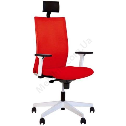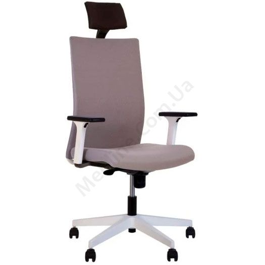 Операторське крісло з сітчастою спинкою, регульованими підлокітниками, підголівником, фіксацією у 5 положеннях, на білій пластиковій основі.