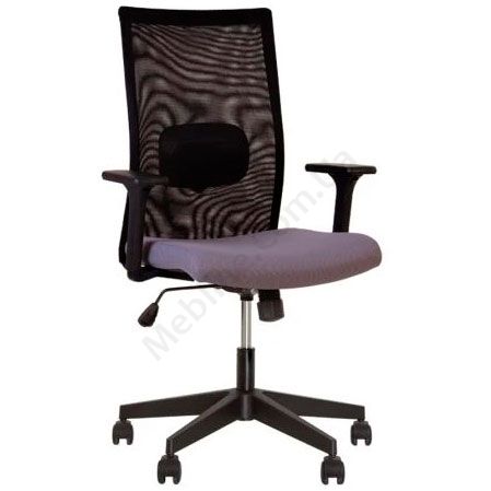 Операторське крісло з сітчастою спинкою і регульованою поперековою підтримкою, регульованими пластиковими підлокітниками, фіксацією у вертикальному положенні, на чорній пластиковій основі.