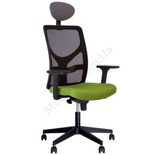 Операторське крісло з сітчастою спинкою, регульованими підлокітниками, підголівником, фіксацією у 5 положеннях, на чорній пластиковій основі.