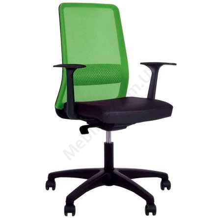 Комп’ютерне поворотне крісло з сітчастою спинкою та поперековою підтримкою, пластиковими підлокітниками, фіксацією у 3 положеннях, на чорній пластиковій основі.