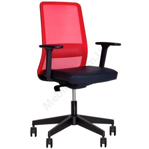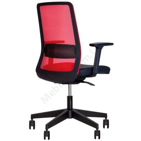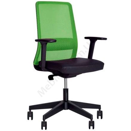 Комп’ютерне поворотне крісло з сітчастою спинкою та поперековою підтримкою, регульованими пластиковими підлокітниками, фіксацією у 3 положеннях, на чорній пластиковій основі.