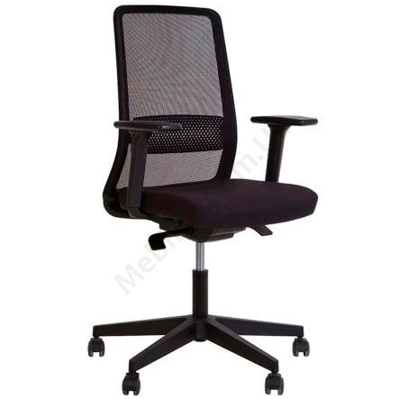 Комп’ютерне крісло з сітчастою спинкою, регульованими підлокітниками, фіксацією у 5 положеннях, на чорній пластиковій основі.