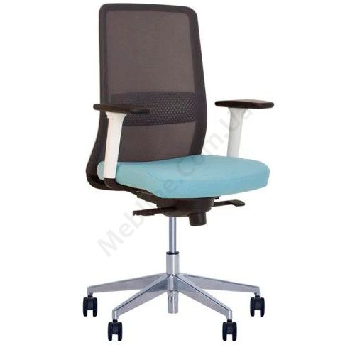 Комп’ютерне поворотне крісло з сітчастою спинкою та поперековою підтримкою, регульованими пластиковими підлокітниками білого кольору, фіксацією у 4 положеннях, на металевій алюмінієвій основі.