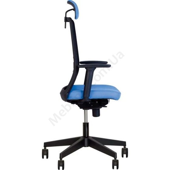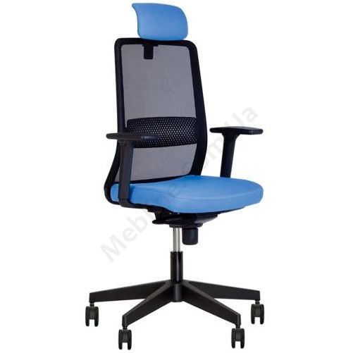 Комп’ютерне крісло з сітчастою спинкою, регульованими підлокітниками, фіксацією у 5 положеннях, на чорній пластиковій основі.