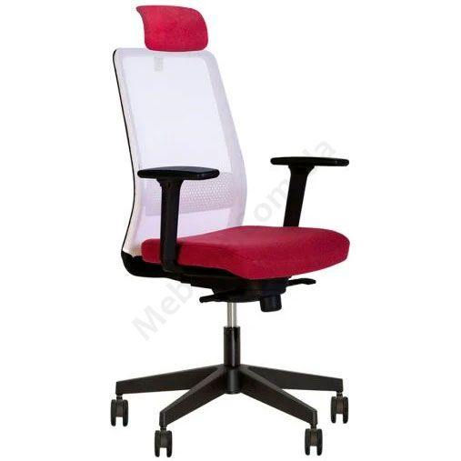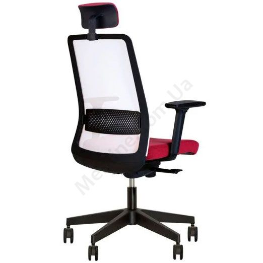 Комп’ютерне поворотне крісло з сітчастою спинкою та поперековою підтримкою, регульованими пластиковими підлокітниками, фіксацією у 4 положеннях, на чорній пластиковій основі.