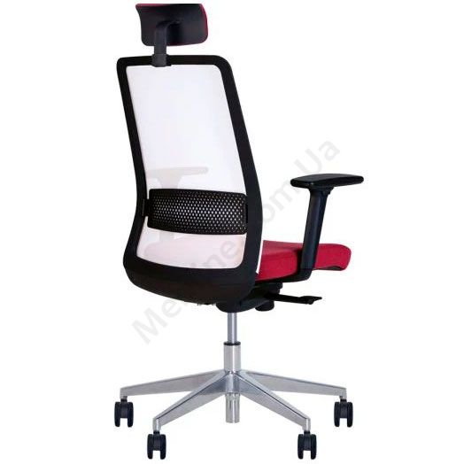 Комп’ютерне поворотне крісло з сітчастою спинкою та поперековою підтримкою, регульованими пластиковими підлокітниками, фіксацією у 4 положеннях, на металевій алюмінієвій основі.