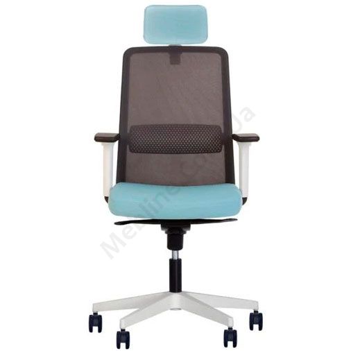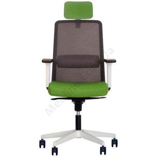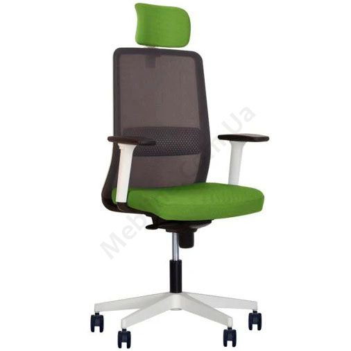 Комп’ютерне крісло з сітчастою спинкою, регульованими підлокітниками, фіксацією у 5 положеннях, на білій пластиковій основі.