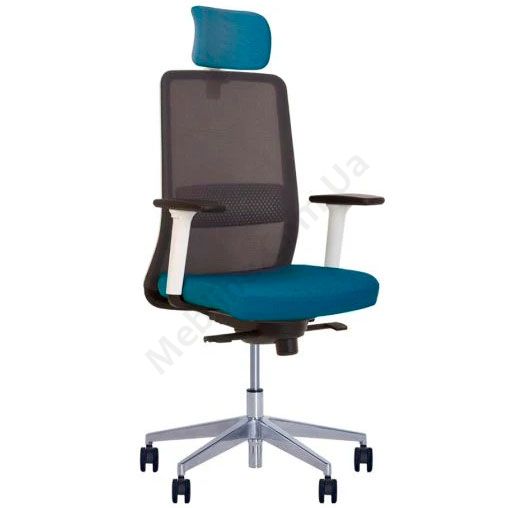 Комп’ютерне поворотне крісло з сітчастою спинкою та поперековою підтримкою, регульованими пластиковими підлокітниками білого кольору, фіксацією у 4 положеннях, на металевій алюмінієвій основі.