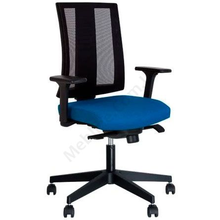Комп’ютерне поворотне крісло з сітчастою спинкою, регульованими підлокітниками за висотою та уздовж, фіксацією у 4 положеннях, на чорній пластиковій основі.