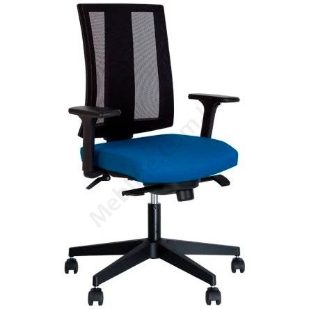 Комп’ютерне поворотне крісло з сітчастою спинкою, регульованими підлокітниками за висотою, по ширині та уздовж, фіксацією у 4 положеннях, на чорній пластиковій основі.