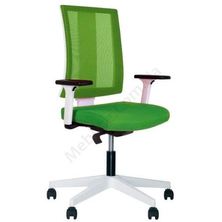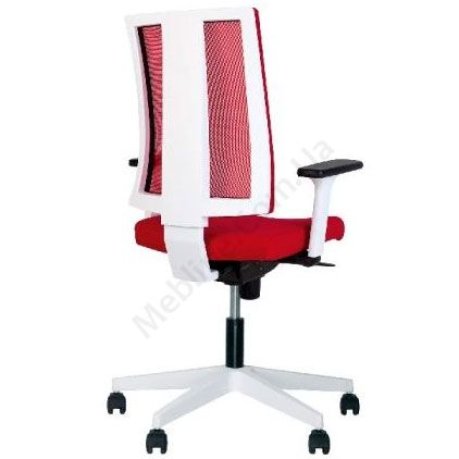 Комп’ютерне крісло з сітчастою спинкою, регульованими підлокітниками за висотою та уздовж, фіксацією у 5 положеннях, на білій пластиковій основі.