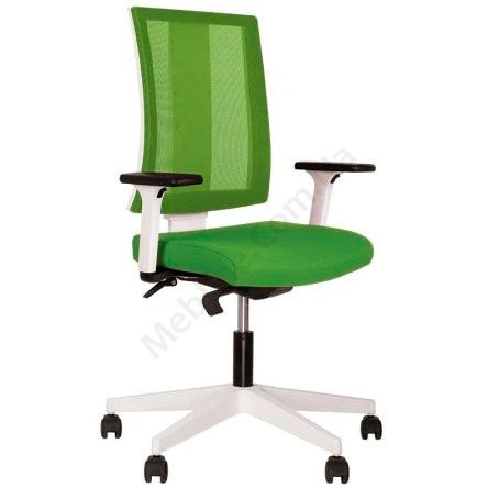 Комп’ютерне поворотне крісло з сітчастою спинкою, регульованими підлокітниками за висотою, по ширині та уздовж, фіксацією у 3 положеннях, на білій пластиковій основі.