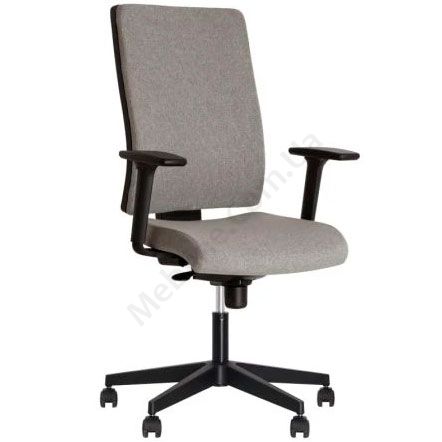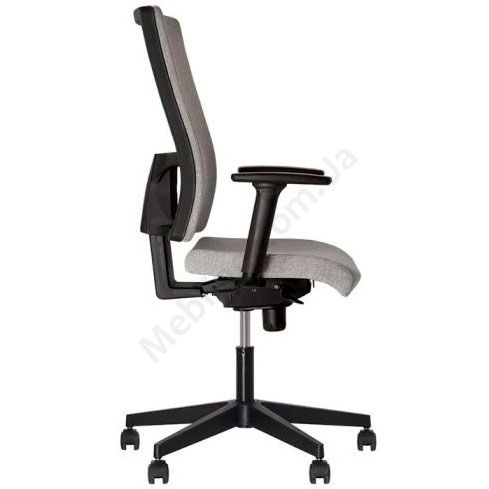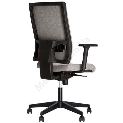 Комп’ютерне крісло з м’якою спинкою, регульованими підлокітниками, фіксацією у 5 положеннях, на чорній пластиковій основі.