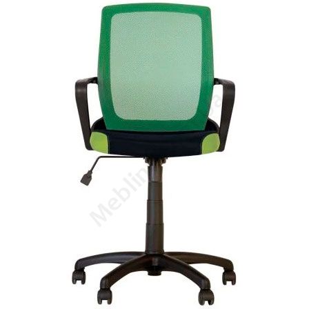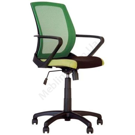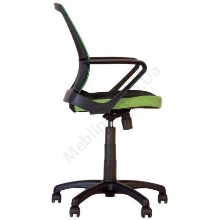 Операторське крісло з дихаючою спинкою, підлокітниками, фіксацією у вертикальному положенні, на чорній пластиковій основі.