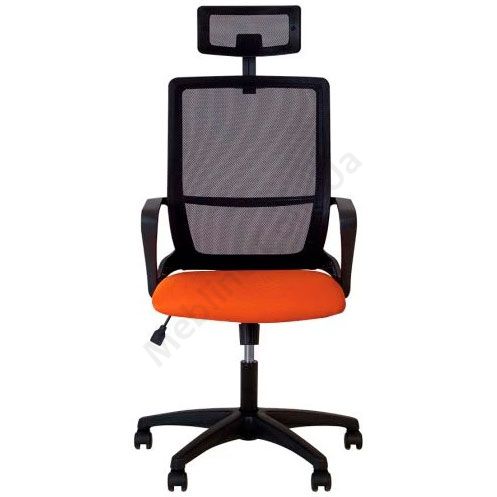 Операторське крісло з підлокітниками, підголівником, сидінням та сітчастою спинкою, на чорній пластиковій основі.