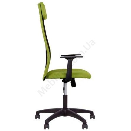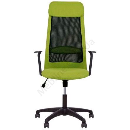 Комп’ютерне крісло з дихаючою спинкою, підлокітниками, фіксацією у вертикальному положенні, на чорній пластиковій основі.