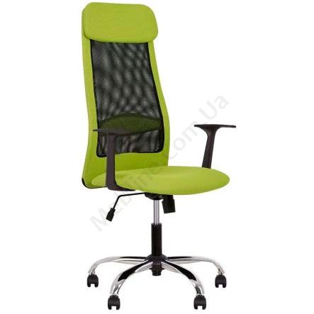 Комп’ютерне крісло з дихаючою спинкою, підлокітниками, фіксацією у вертикальному положенні, на хромованій основі.