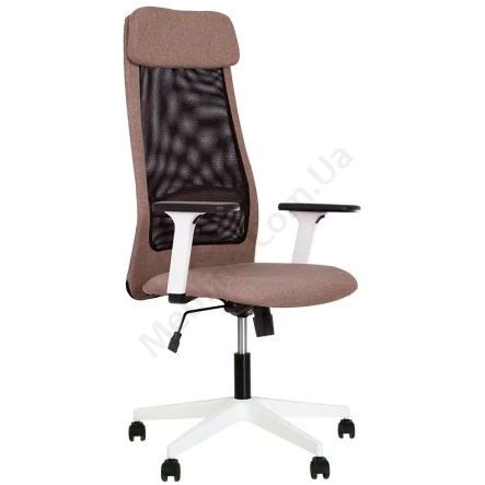 Комп’ютерне крісло з дихаючою спинкою, регульованими підлокітниками, фіксацією у вертикальному положенні, на білій пластиковій основі.