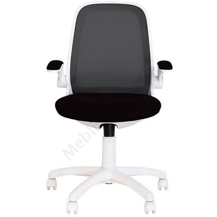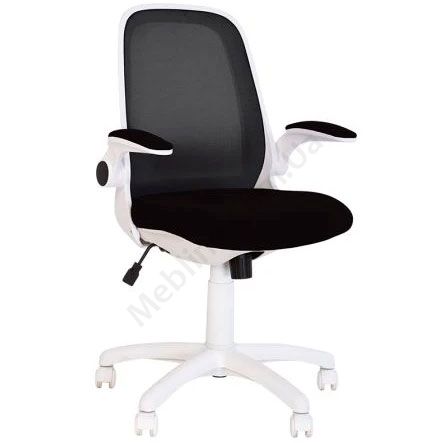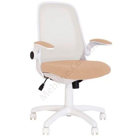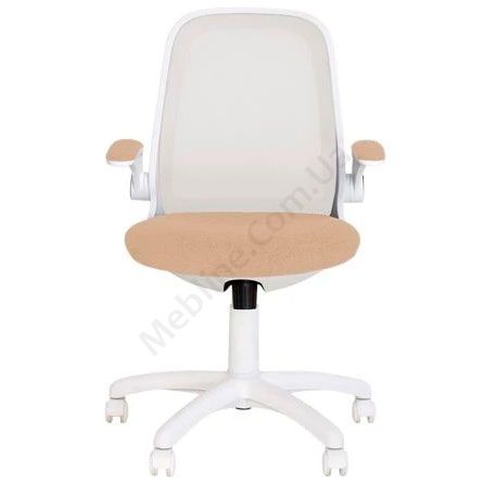 Операторське крісло з дихаючою спинкою, відкидними підлокітниками, фіксацією у вертикальному положенні, на білій пластиковій основі.