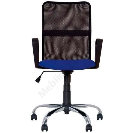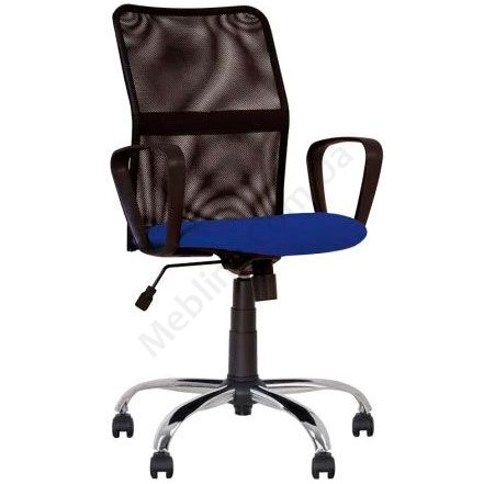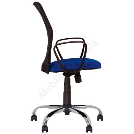 Операторське крісло з дихаючою спинкою, відкидними підлокітниками, фіксацією у вертикальному положенні, на чорній пластиковій основі.