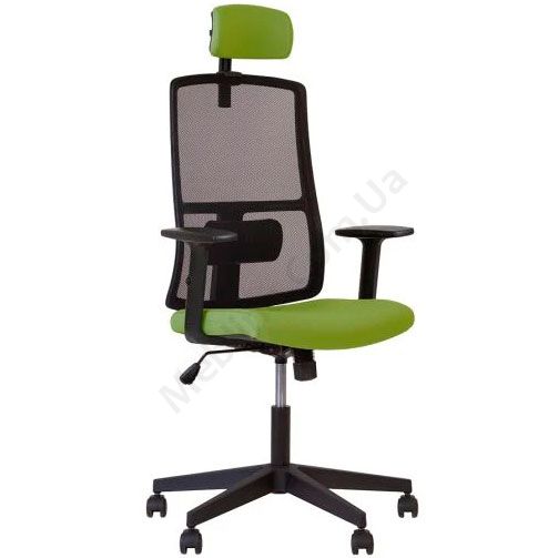 Комп’ютерне крісло з дихаючою спинкою, регульованими пластиковими підлокітниками, підголівником, фіксацією у вертикальному положенні, на пластиковій основі.