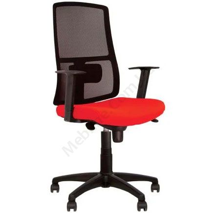 Комп’ютерне крісло з сітчастою спинкою, регульованими підлокітниками, фіксацією у 5 положеннях, на чорній пластиковій основі.