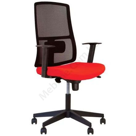 Комп’ютерне крісло з сітчастою спинкою, регульованими підлокітниками, фіксацією у 5 положеннях, на чорній пластиковій основі.