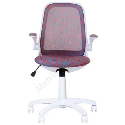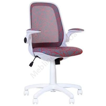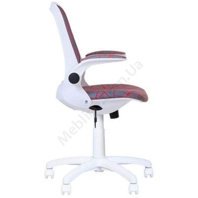 Дитяче поворотне крісло з дихаючою спинкою, відкидними м’якими підлокітниками, фіксацією у вертикальному положенні, на білій пластиковій основі.