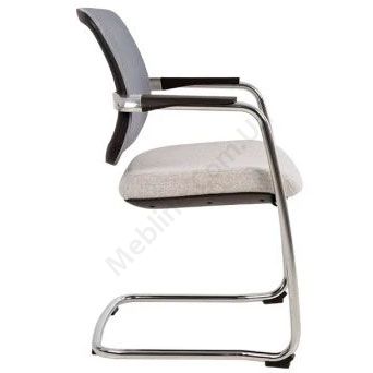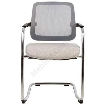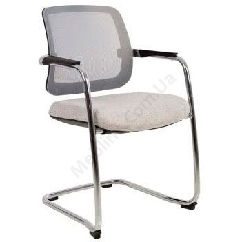 Конференційна версія офісного крісла з металевими підлокітниками з накладками, сітчастою спинкою, на хромованій основі.