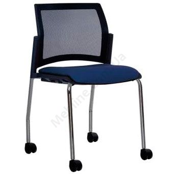 Стілець на роликах без підлокітників з чорними пластиковими елементами та сітчастою спинкою на хромованій рамі.
