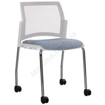 Стілець на роликах без підлокітників з білими пластиковими елементами та сітчастою спинкою на хромованій рамі.