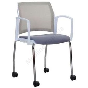 Стілець на роликах з білими пластиковими підлокітниками та сітчастою спинкою на хромованій рамі.