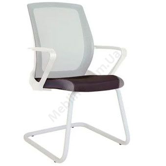 Офісний стілець з дихаючою спинкою на білому металевому каркасі.
